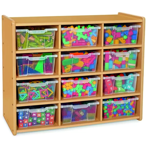Kreş oyuncak dolabı 12 adet plastik oyuncak saklama kutusu ile birlikte teslim edilir.